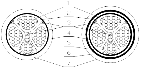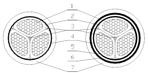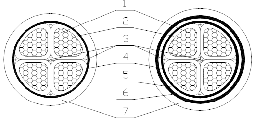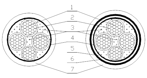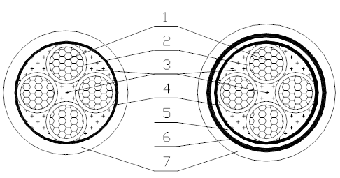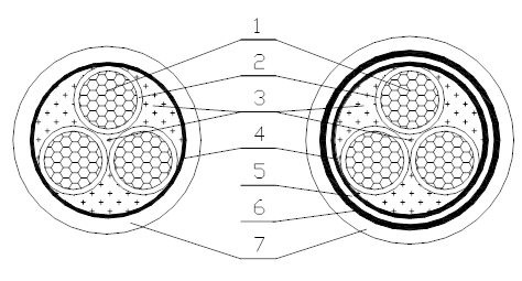 1 導(dǎo)體  2 絕緣  3填充  4 包帶  5 內(nèi)襯層  6 鋼帶  7 外護(hù)套